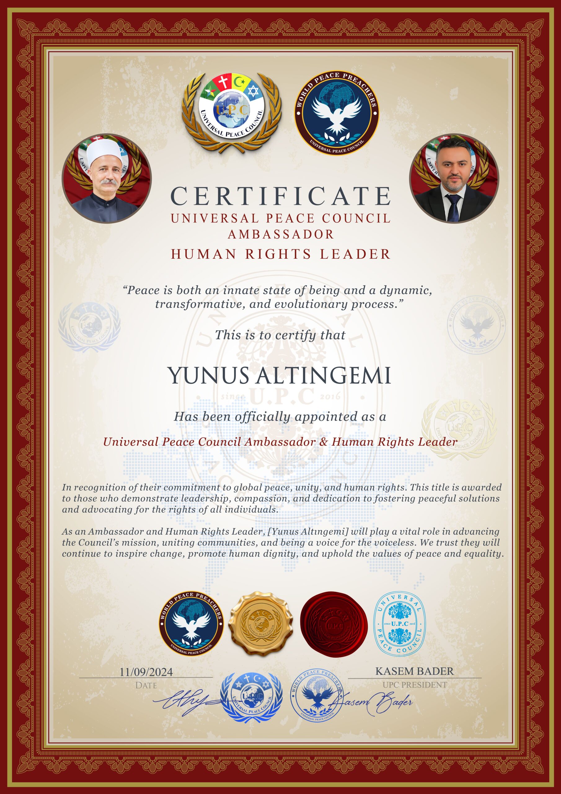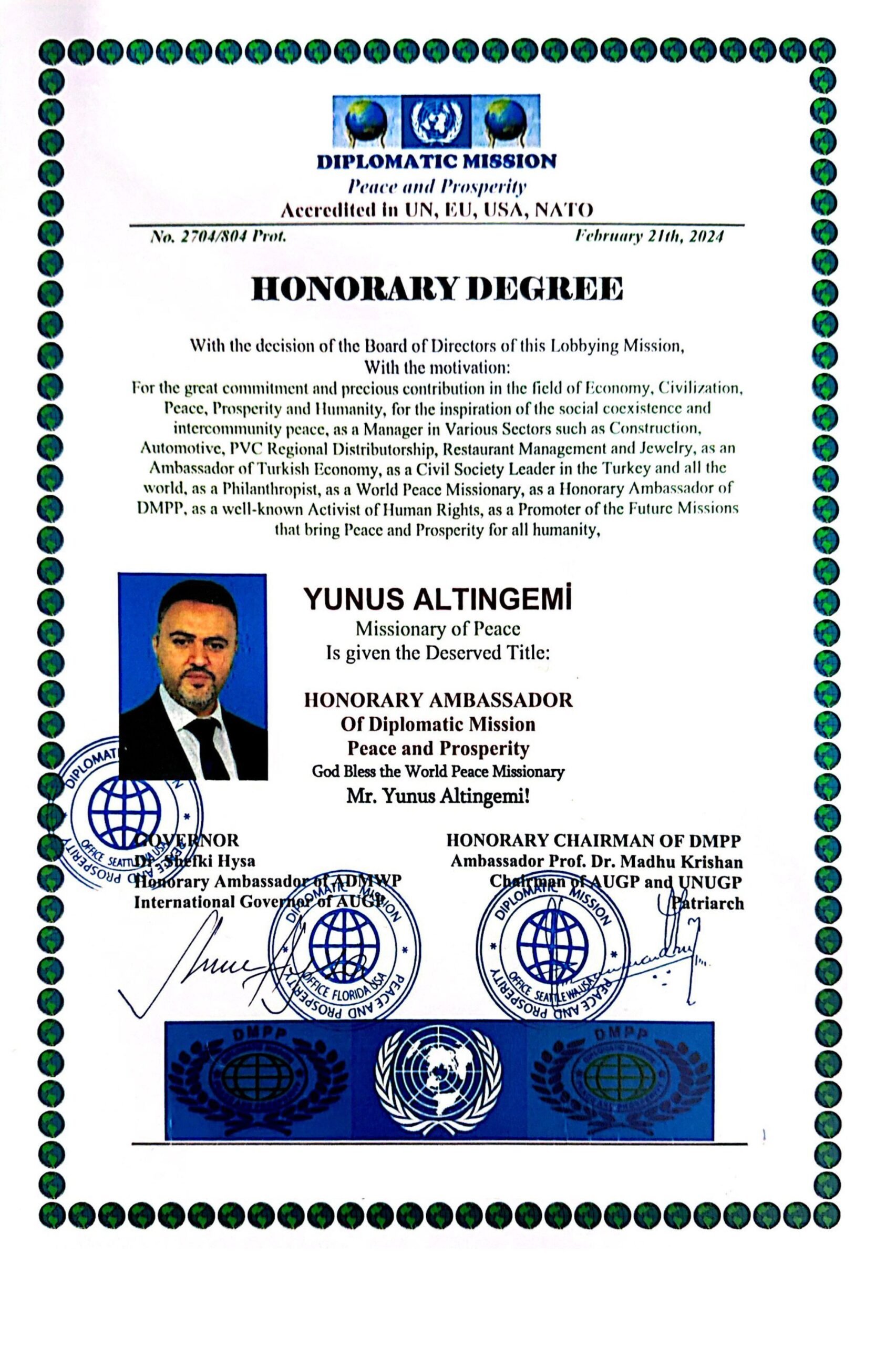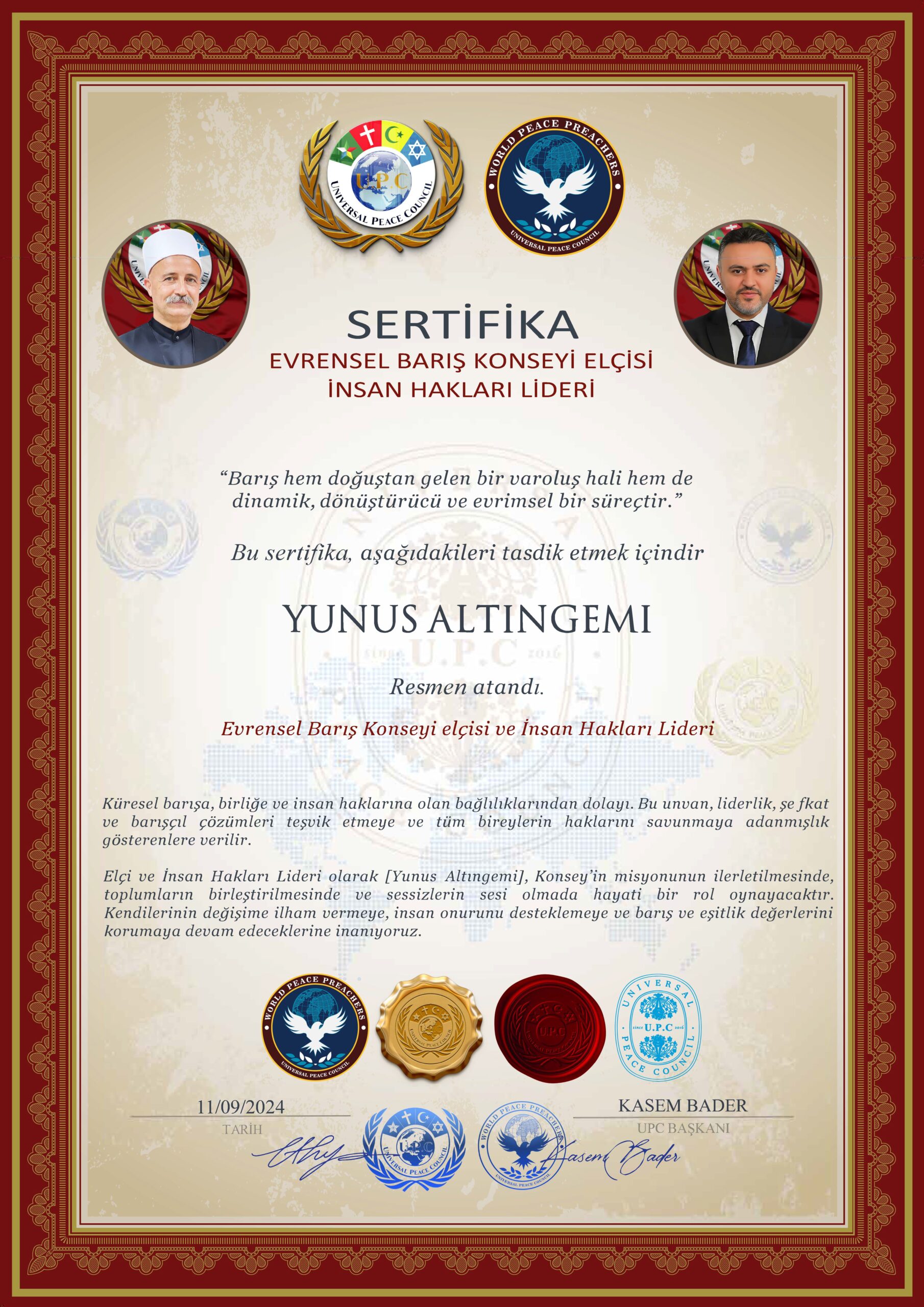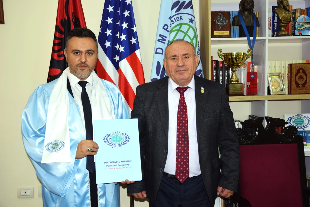 Diplomatic Mission Peace and Prosperity (DMPP) Başkanı Dr. Shefki Hysa ve Diplomatic Mission Peace and Prosperity (DMPP) Onursal Büyükelçisi ve DMPP Türkiye Temsilcisi Sayın Yunus Altıngemi.
